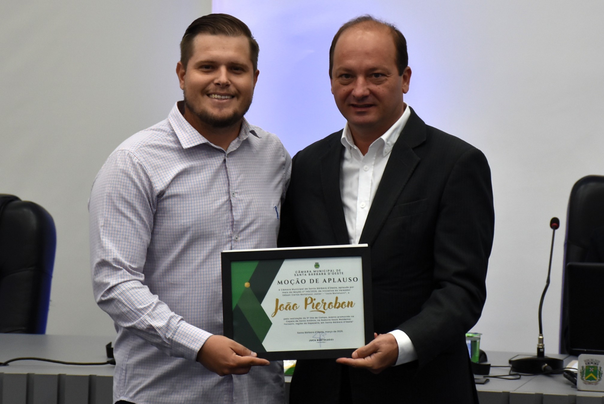 Durante a sessão, também foram realizadas entregas de moções de aplauso a munícipes. Entre elas, a Moção nº 149/2026, de autoria do vereador Juca Bortolucci, homenageou João Pierobon pela realização do 5º Dia de Campo, evento promovido na Capela de Santo Antônio, na região do Sapezeiro.