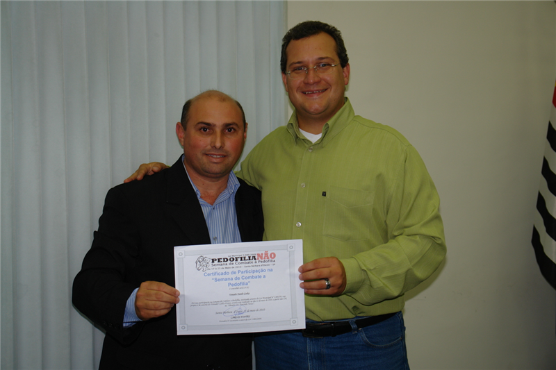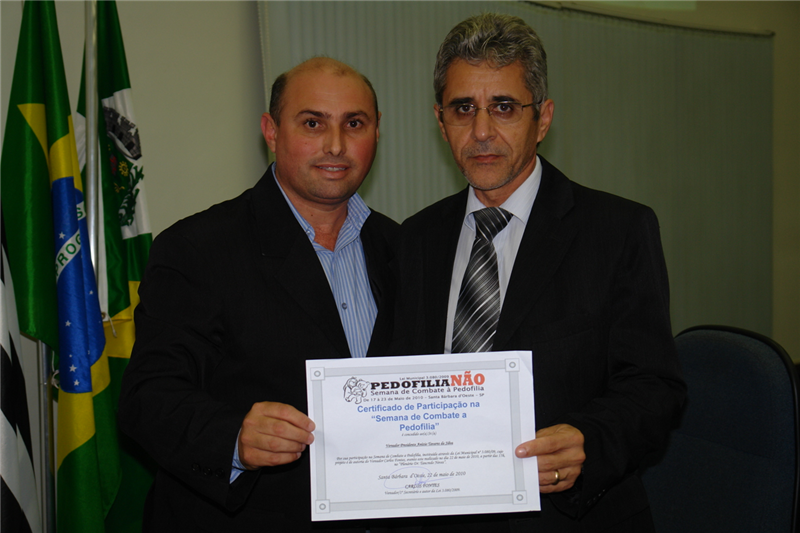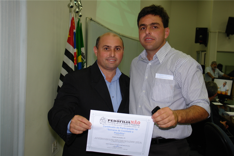 No final da 19ª Reunião Ordinária, enquanto se pronunciava na Palavra Livre, o vereador Carlos Fontes (DEM) agradeceu os parlamentares que compareceram ao evento “Pedofilia Não”, realizado no sábado, dia 22, durante a semana de combate à pedofilia. Ele aproveitou a reunião para entregar um certificado de participação ao presidente da Câmara barbarense, Anízio Tavares da Silva (DEM), e aos vereadores Danilo Godoy (PSDB), Ducimar Cardoso, o Kadu Garçom (PR), e José Antonio Aborihan Gonçalves, o Zeca (PV).