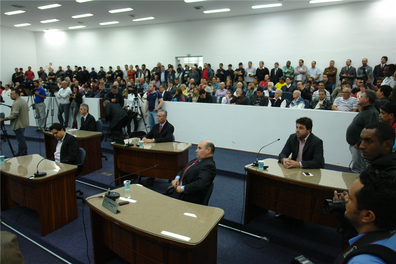 A Câmara de Santa Bárbara d’Oeste promoveu, nesta quinta-feira (21), a 3ª Reunião Extraordinária de 2012, para a posse do vice-prefeito Luis Vanderlei Larguesa (PT), em virtude do afastamento do prefeito Mário Heins (PDT), conforme decisão do Tribunal de Justiça do Estado de São Paulo. A sessão contou com a presença dos 12 vereadores, de familiares do prefeito empossado, militantes do PT e de outros partidos que apoiam o afastamento de Heins (PDT).