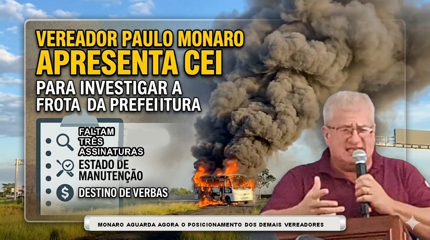Após o incêndio ocorrido com ônibus oficial da Prefeitura na rodovia dos Bandeirantes (SP-348), o vereador Paulo Monaro protocolou o Requerimento nº 137/2026 na Câmara Municipal solicitando a criação de uma Comissão Especial de Inquérito (CEI) para apurar possíveis irregularidades na gestão, manutenção, regularidade documental e condições de segurança de toda a frota de veículos do Município. Além do autor, já assinaram o pedido os vereadores Carlos Fontes, Wilson da Engenharia e Celso Ávila. Para que a comissão seja oficialmente instaurada, ainda são necessárias mais três assinaturas.