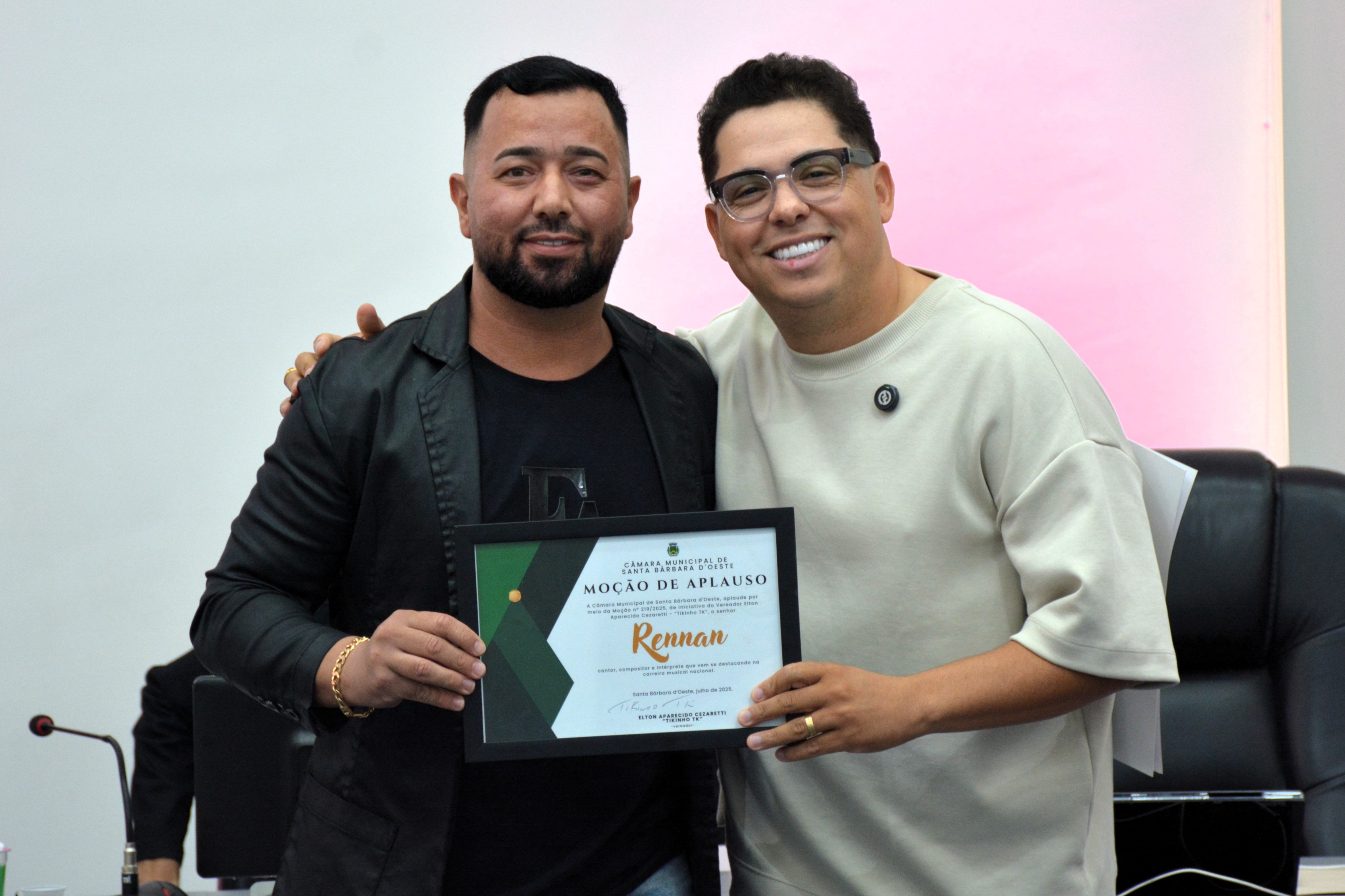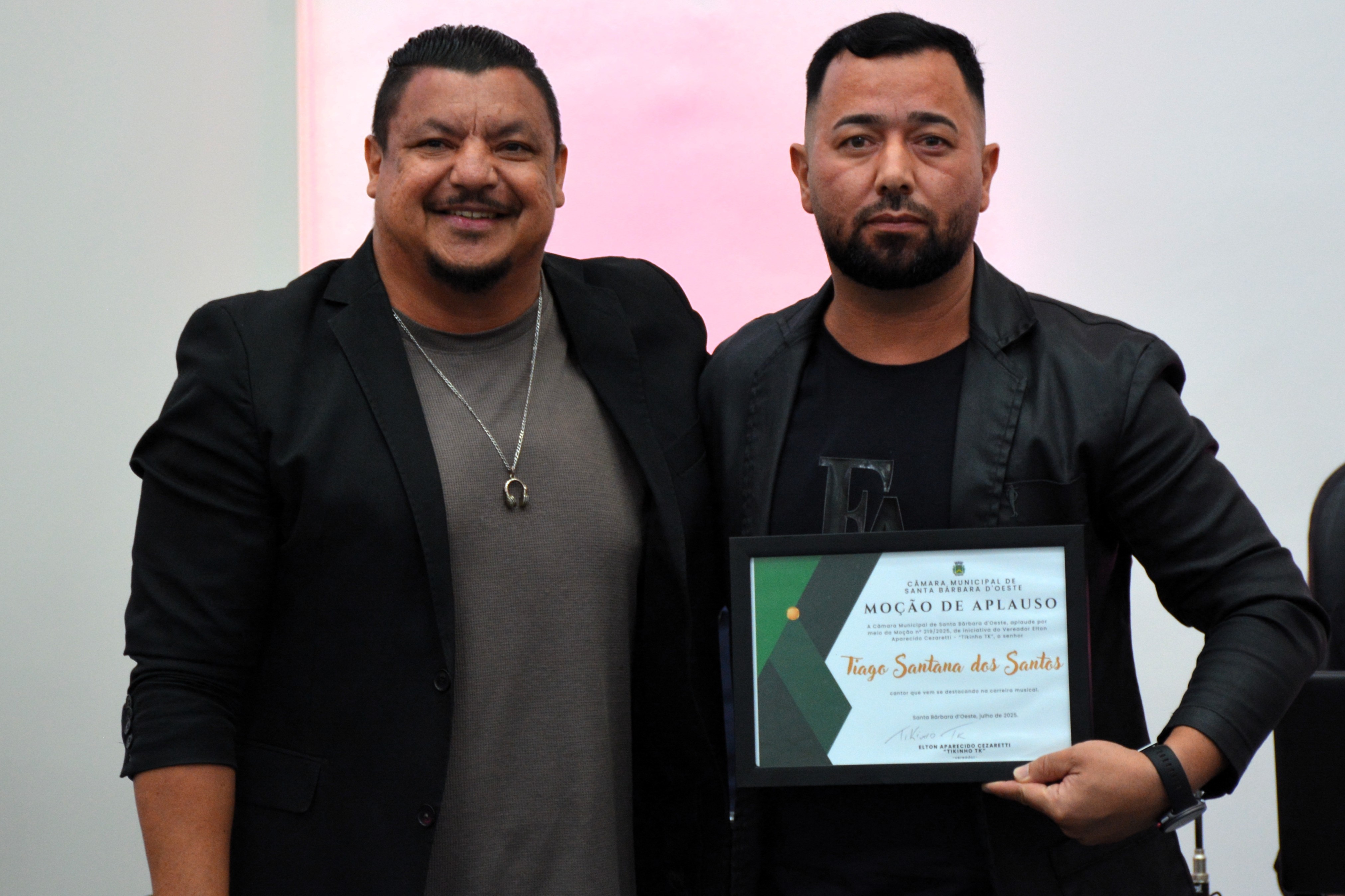 Durante a sessão, o vereador Tikinho TK também realizou a entrega das moções de aplauso aprovadas anteriormente. O parlamentar homenageou o cantor Tiago Santana dos Santos, reconhecido pelo destaque em sua trajetória musical, e o músico Rennan, cantor, compositor e intérprete que vem ganhando projeção nacional. As homenagens, formalizadas por meio das Moções de Aplauso nº 190/2025 e nº 219/2025, ressaltaram o talento e a dedicação dos artistas barbarenses à música.